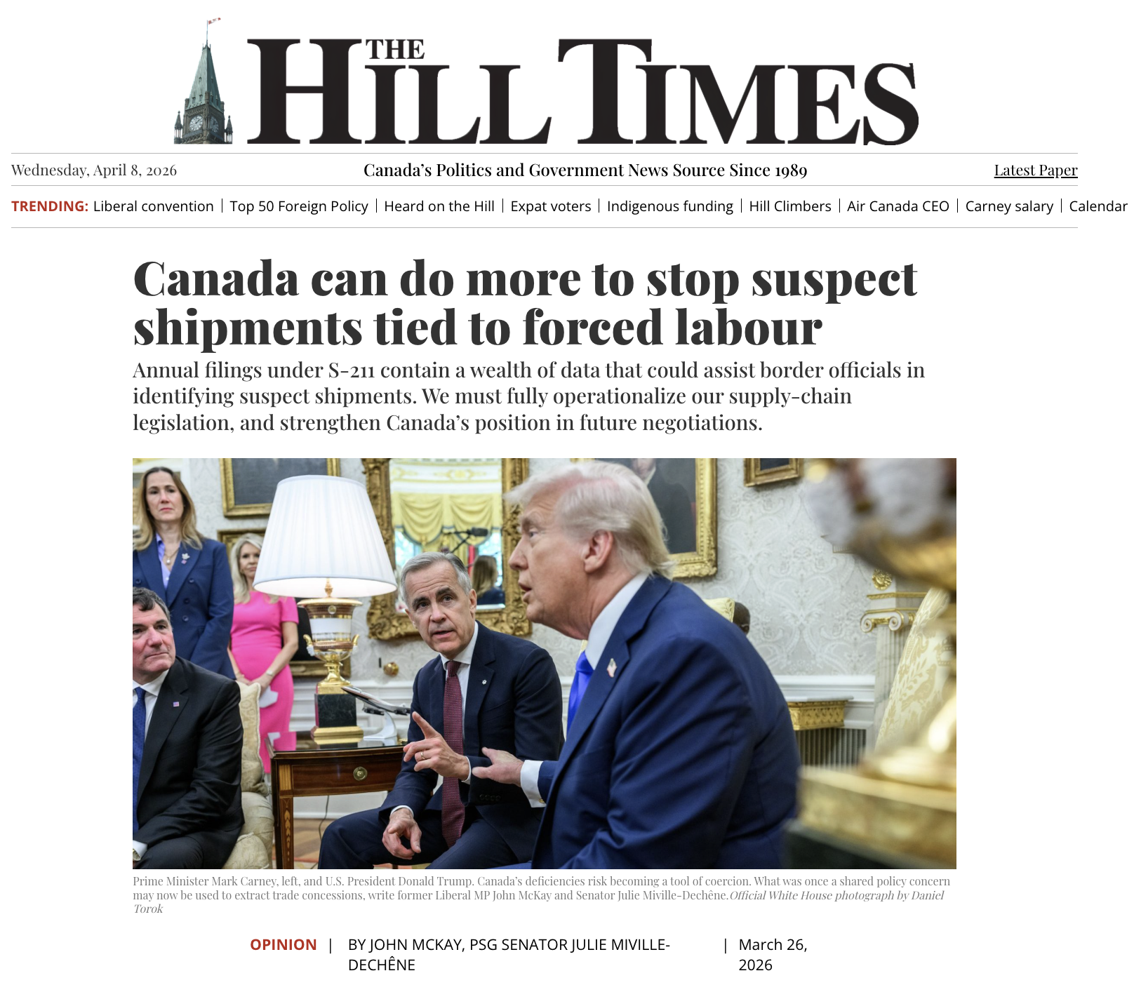 Successfully co-sponsored Bill S-211, An Act to enact the Fighting Against Forced Labour and Child Labour in Supply Chains Act and to amend the Customs Tariff and received Royal Assent on May 11, 2023 (Predecessor Bill S-423).